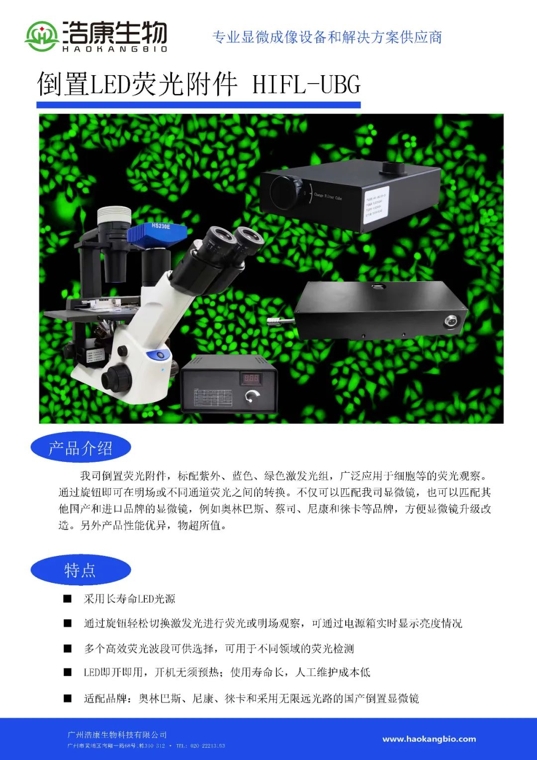 近日,浩康生物為華南某高校老師提供倒置顯微鏡熒光升級方案,成功解決了奧林巴斯IX71顯微鏡熒光成像的需求,并贏得了客戶的認可。該方案主要采用了浩康生物倒置熒光附件HIFL-UBG來實現,倒置熒光附件HIFL-UBG采用長壽命大功率LED光源,多個高效熒光波段可供選擇,可用于不同領域的熒光檢測。通過旋鈕或拉桿即可在明場或不同通道熒光之間的轉換。另外該附件采用模塊化設計,方便顯微鏡升級改造,可匹配國內外主流品牌的倒置顯微鏡,例如:奧林巴斯、尼康和徠卡等。