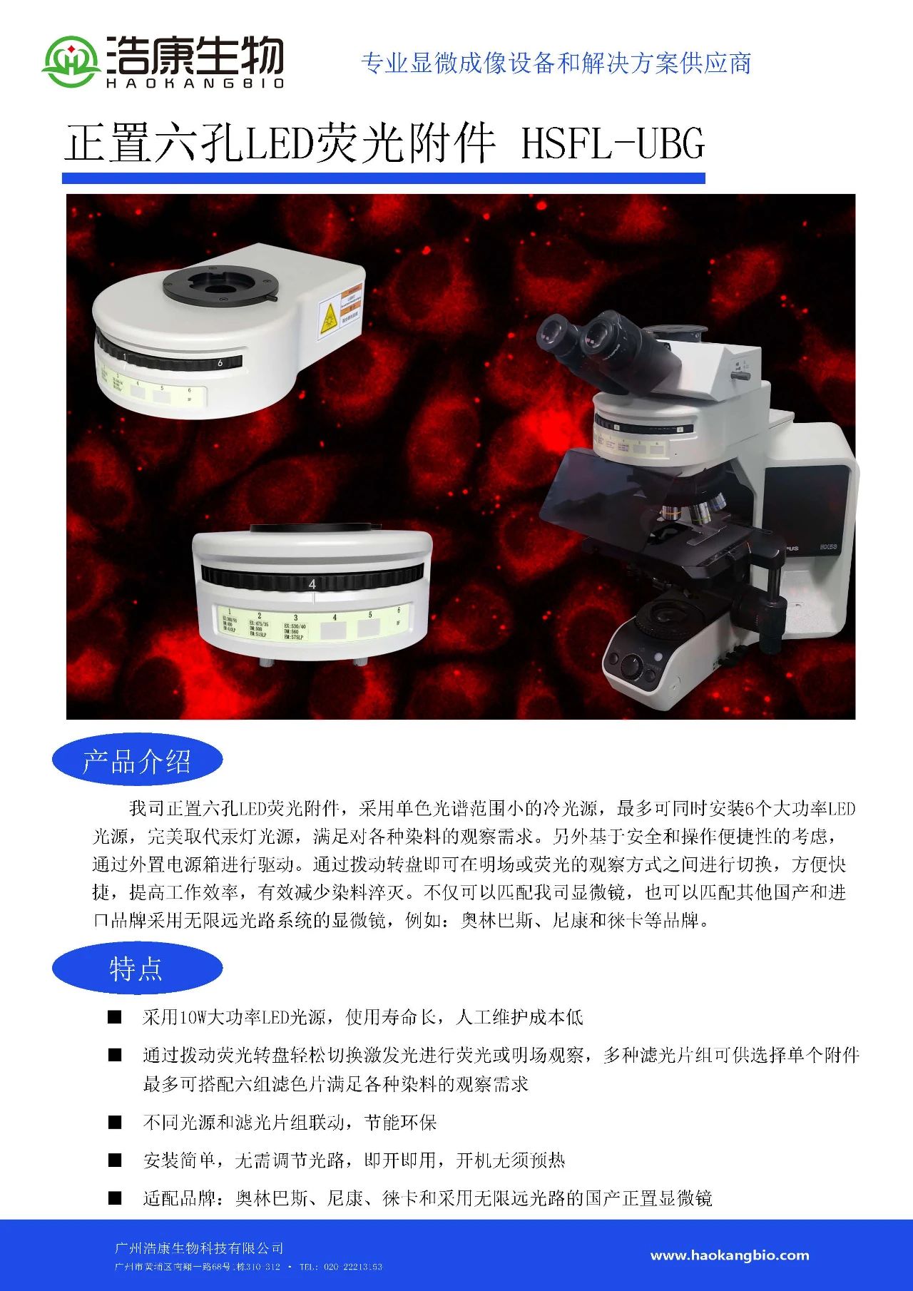 浩康生物正置六孔LED熒光附件HSFL-UBG采用單色光譜范圍小的冷光源,最多可同時(shí)安裝6個(gè)大功率LED光源,完美取代汞燈光源,滿足各種染料的觀察需求。通過(guò)撥動(dòng)熒光轉(zhuǎn)盤(pán)即可在明場(chǎng)或熒光的觀察方式之間進(jìn)行切換,方便快捷,有效提高工作效率。另外,該產(chǎn)品適用性廣,可完美適配國(guó)產(chǎn)和進(jìn)口品牌采用無(wú)限遠(yuǎn)光路系統(tǒng)的顯微鏡,例如,奧林巴斯、蔡司、尼康和徠卡等知名品牌。