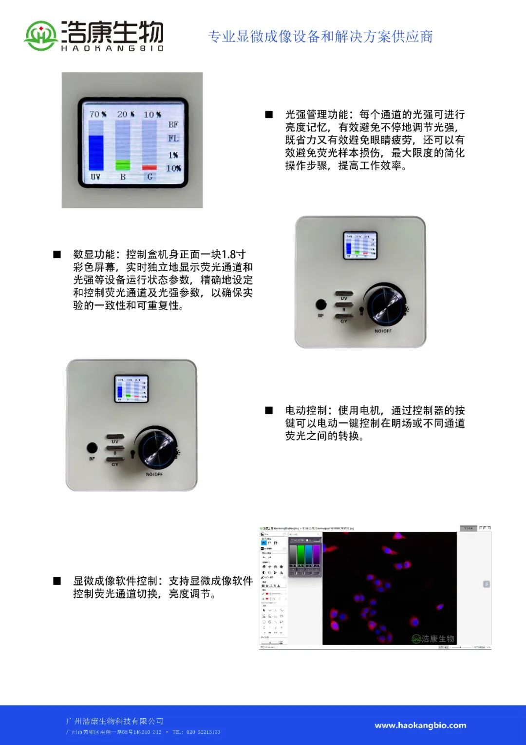 浩康生物新款電動倒置LED熒光附件兼具老款性價比也有以下特點:電動控制,靈活切換,亮度持續可調、精準數顯,超長使用壽命;是又一款助力高校科研及生產的利器。