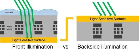 最新的背照式芯片技術(shù)將芯片反過來,光直接照射在芯片上,不用穿過上述的金屬結(jié)構(gòu)層,對信號的阻擋也就不存在了。這樣可以獲得近乎完美的95% 峰值量子效率而且可以實(shí)現(xiàn)低至200nm的深紫外和高至1100nm的近紅外探測。