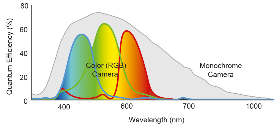 黑白相機(jī)由于其量子效率更高,業(yè)界青睞于將它用于熒光應(yīng)用。彩色相機(jī)的量子效率低于黑白相機(jī)——導(dǎo)致出現(xiàn)這種差異的技術(shù)因素在于彩色相機(jī)中每個像素上的拜耳微型濾色片只能讓特定的波長通過。這種過濾機(jī)制是為了使用“去拜耳化”的過程來計(jì)算圖像的顏色信息。由于濾色片會阻擋一定量的光,因此到達(dá)像素的光子反應(yīng)區(qū)域的光子會有所減少。除了芯片上的拜爾濾色片結(jié)構(gòu)外,彩色相機(jī)中的紅外截止濾光片也起到限制光線通過的作用,因?yàn)樗€可阻擋約650 - 700 nm以上的光線。