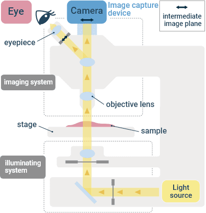 顯微鏡成像是基于光學放大和目鏡放大的原理,使得人眼可以觀察到被放大的微小結構和細節。顯微鏡成像主要靠物鏡和場鏡組成的透鏡系統對樣品進行放大成像,該像所在的平面稱為中間像平面,中間像平面正好落在目鏡的焦距上,進而被二次放大。