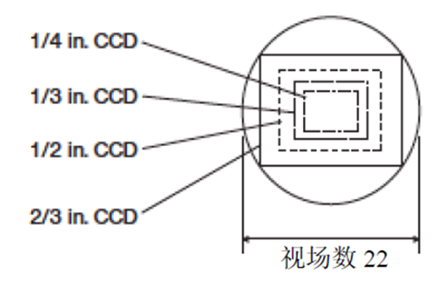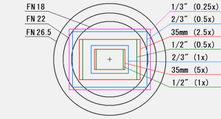 上圖是采用0.5x C接口相機適配器時各圖像傳感器尺寸的成像視野的范圍,光路經過0.5x C接口相機適配器會將中間像縮小1/2后投射到傳感器上,此時2/3英寸圖像傳感器中圖像將和目鏡下一致,1/2略小一些,均很好的還原了目鏡下的視野。當使用超過2/3英寸圖像傳感器時,在視野周邊可能會發生光量不足或部分圖像被切掉。