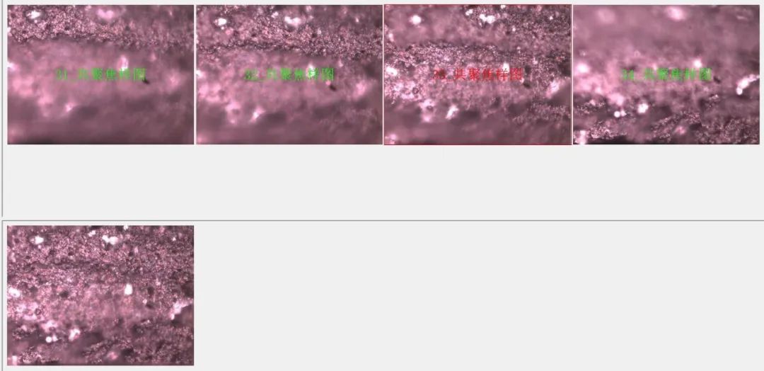 將不同景深的多幅圖像合并為一張清晰的圖像,在下面的界面中,上部分是4張不同景深的圖像,下部分是景深融合后的結果。