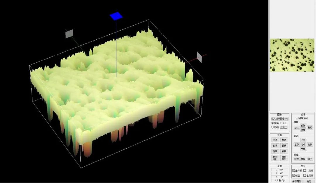 可根據平面圖像中像素色調的不同,構建該平面圖像的三維效果。生成三維示意圖后,可直觀地觀察試樣的效果,比如,表面是否平整等。