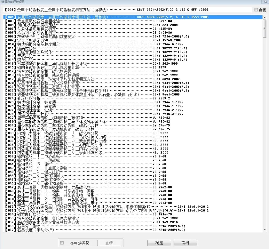 軟件包含150個常用檢驗標準(主要包括GB、JB、QC/T、DL、TB/T、ISO、ASTM、JIS等) 共計600多個金相圖像分析模塊,包括晶粒度、非金屬夾雜、脫碳層、定量金相、相面積分析等。