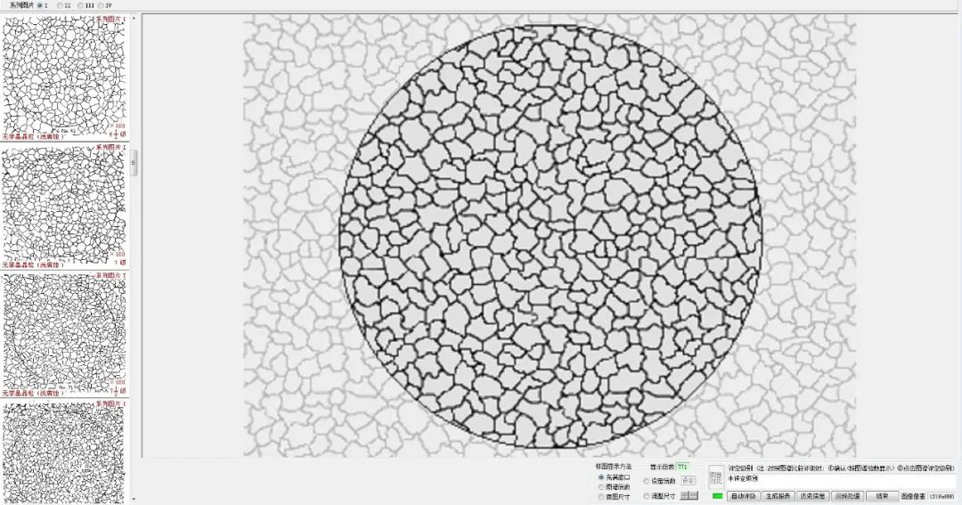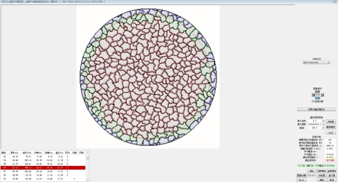 3. 自動評級:軟件自動算出周長、面積、長軸、短軸、等效圓直徑、寬高比、相面積百分比等幾何形態參數,然后套用級別計算公式,算出級別。